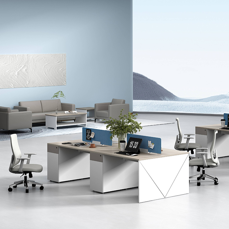 1、基材:符合E0級(jí)標(biāo)準(zhǔn)的MFC板材 2、支撐腳V造型鑼工藝線,涂黑色 3、線盒:多功能線盒(夾屏風(fēng)、出線孔一體) 4、支撐柜:抽屜/主機(jī)收納/機(jī)械鎖 5、配有過線系統(tǒng)/6個(gè)86插座 6、桌屏布顏色:藍(lán)色